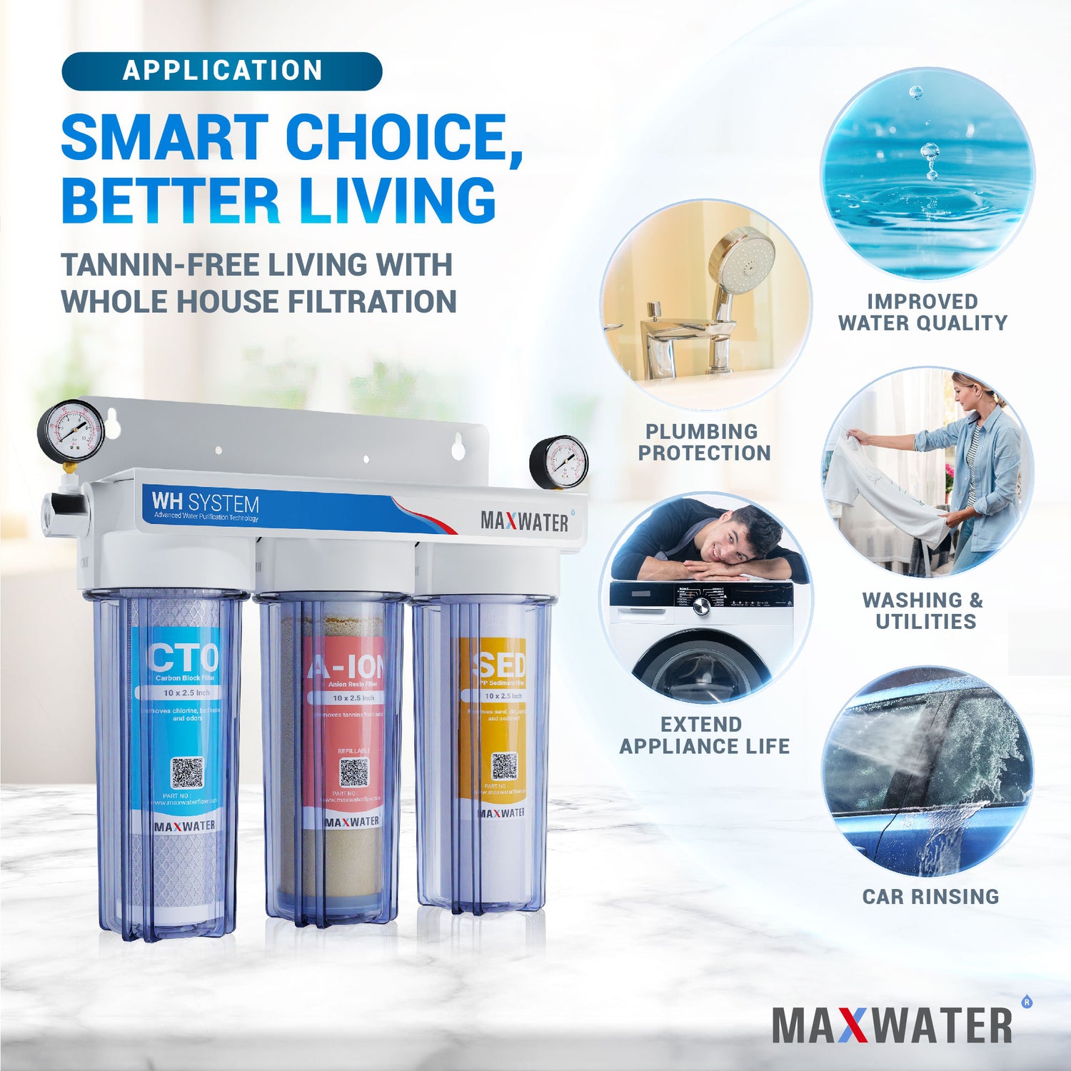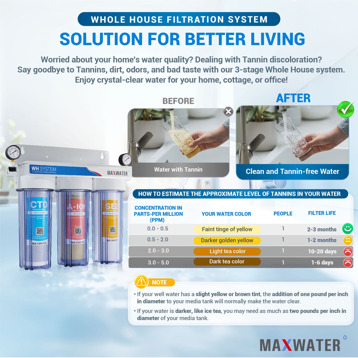 Explore our 3-stage Whole House/Cottage Water Filter, designed for efficient tannin removal and superior water filtration. Ideal for smaller spaces like RVs, apartments, and cottages, this system effectively removes sediment, pesticides, odors, and more. The pre-loaded cartridges and included components ensure a hassle-free setup. With a 6 to 12-month filter life, this compact water filtration solution is optimized for whole-house use. Benefit from tannin removal, anion removal, and enhanced water quality. The system features a maximum operating pressure of 125psi and a flow rate of 1-10gpm* for ¾" Inlet/Outlet.
