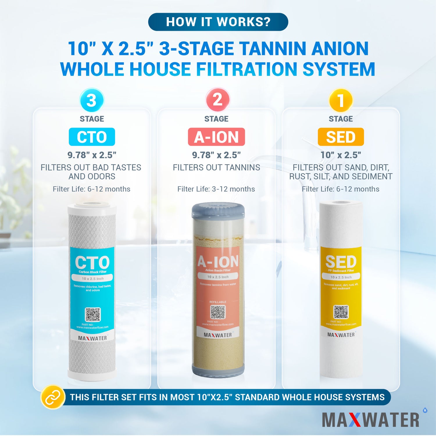 Tannin Reduction, Anion Resin Whole House Water Filtration System, Size - 10” x 2.5" with 3/4" Inlet/Outlet - Tannin-Anion is backordered and will ship as soon as it is back in stock.