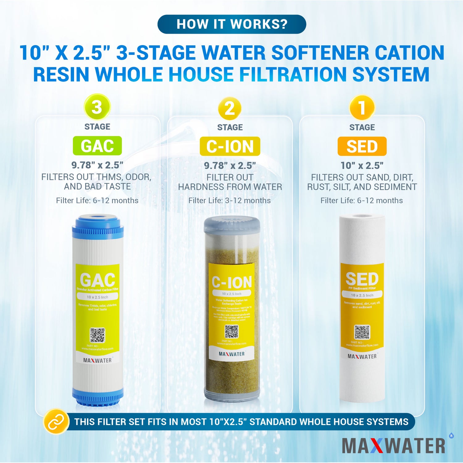 Water Softener, 3-Stage Cation Resin Whole House System, Size - 10” x 2.5" with 3/4-Inch Inlet/Outlet - Water Softener -Cation is backordered and will ship as soon as it is back in stock.