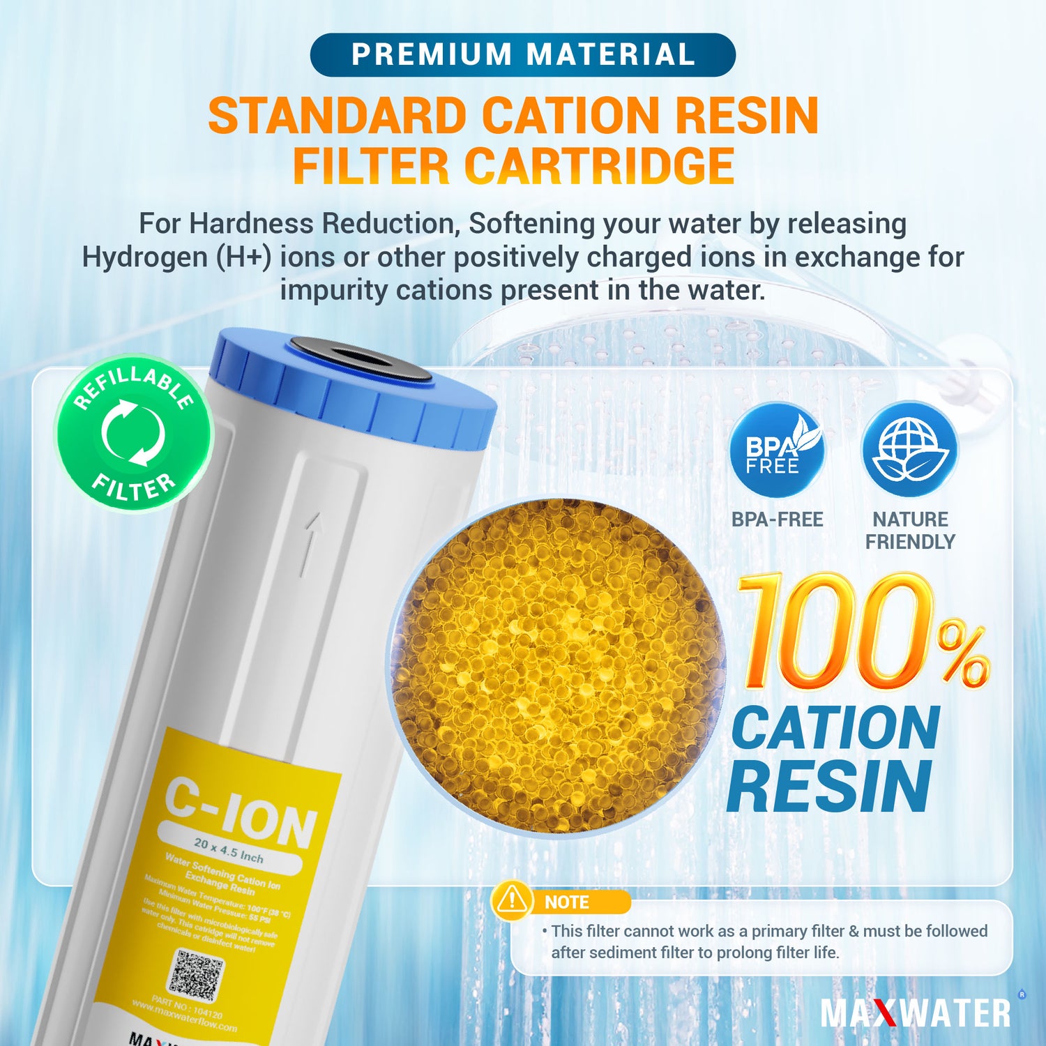 With versatility in mind, this cation resin is suitable for refilling a 20" x 4.5" cartridge once and 2"x 10" in-line refillable filter housing approximately 10 times or a 2.5"x 10" refillable filter (standard 10" housing) about 7 times.