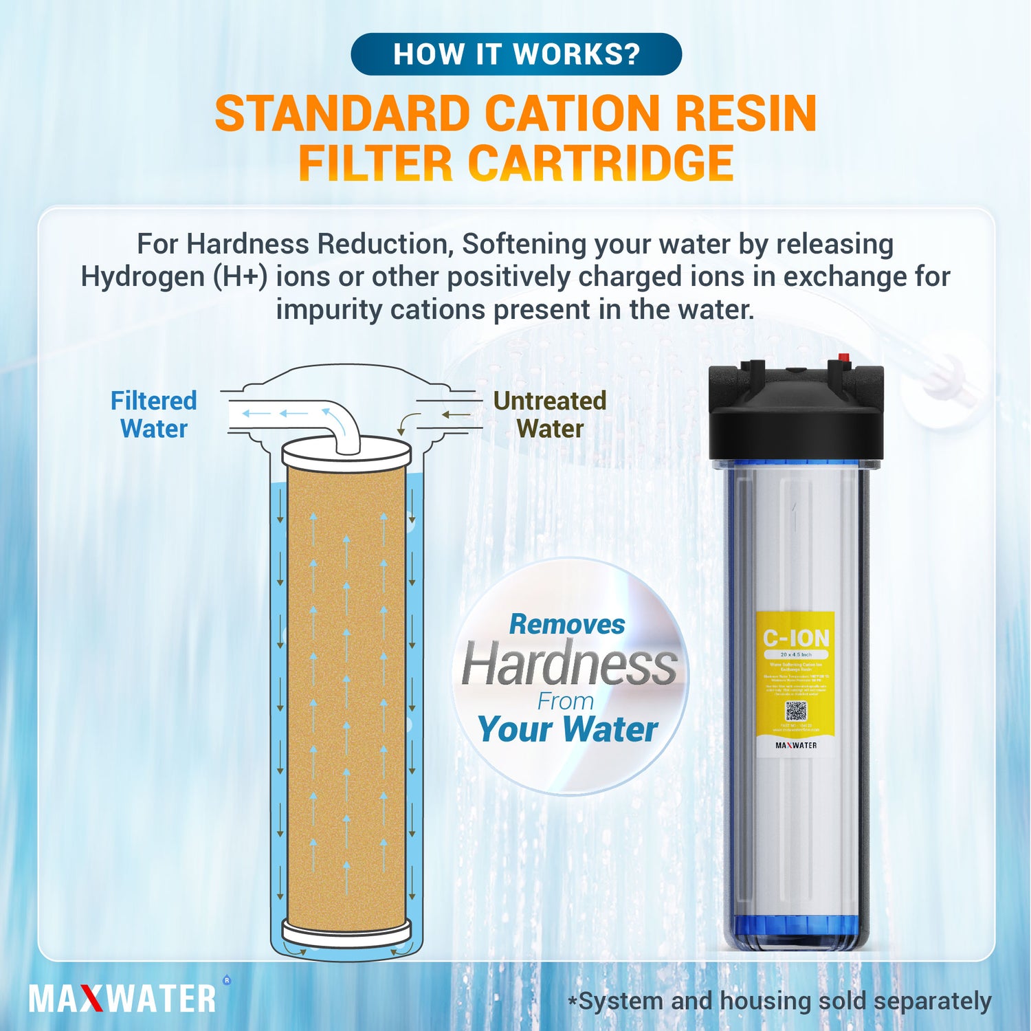 Utilizing the cation exchange resin cartridge, this solution effectively reduces hardness by releasing Hydrogen (H+) ions or other positively charged ions in exchange for impurity cations present in the water. The process involves passing water containing hardness ions, specifically calcium (Ca2+) and magnesium (Mg2+), through a column housing a strongly acidic cation exchange resin in the sodium (Na+) form. The calcium and magnesium ions are then exchanged for an equivalent number of sodium ions.
