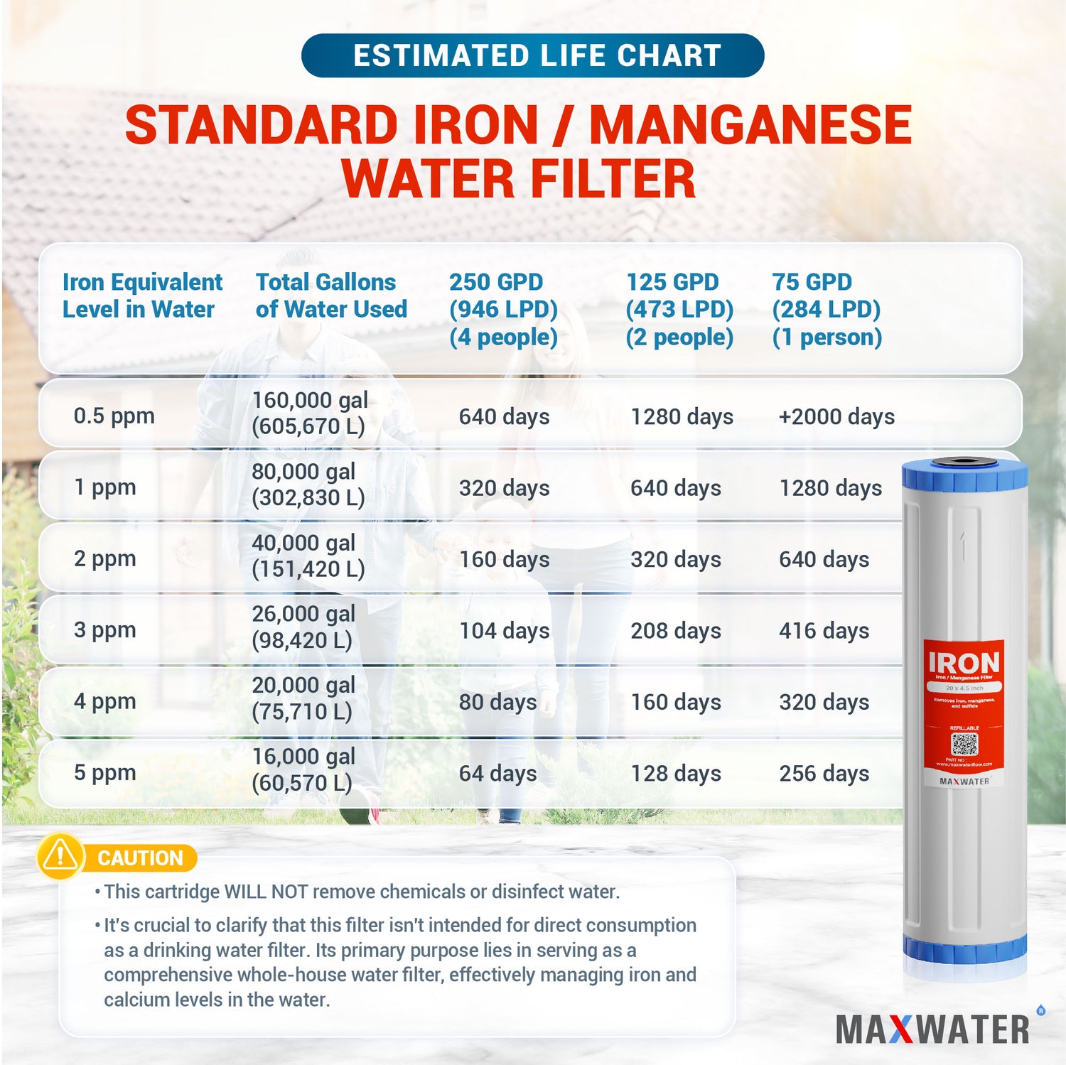 Enhance your water quality with our Iron Manganese Whole House Filter Cartridge. This efficient iron filter cartridge, ensures the removal of soluble iron and manganese, delivering clear and refreshing water throughout your entire home. With a filter life of up to 320 days (Iron level 1 ppm) or 80,000 gallons for 4 users, this system offers reliable performance. As a replacement filter for iron-related concerns, it operates with a preferable feed water pressure of 50-70 PSI to achieve optimal filtration results. Trust this iron filter for a hassle-free and dependable solution for your whole house filtration needs.