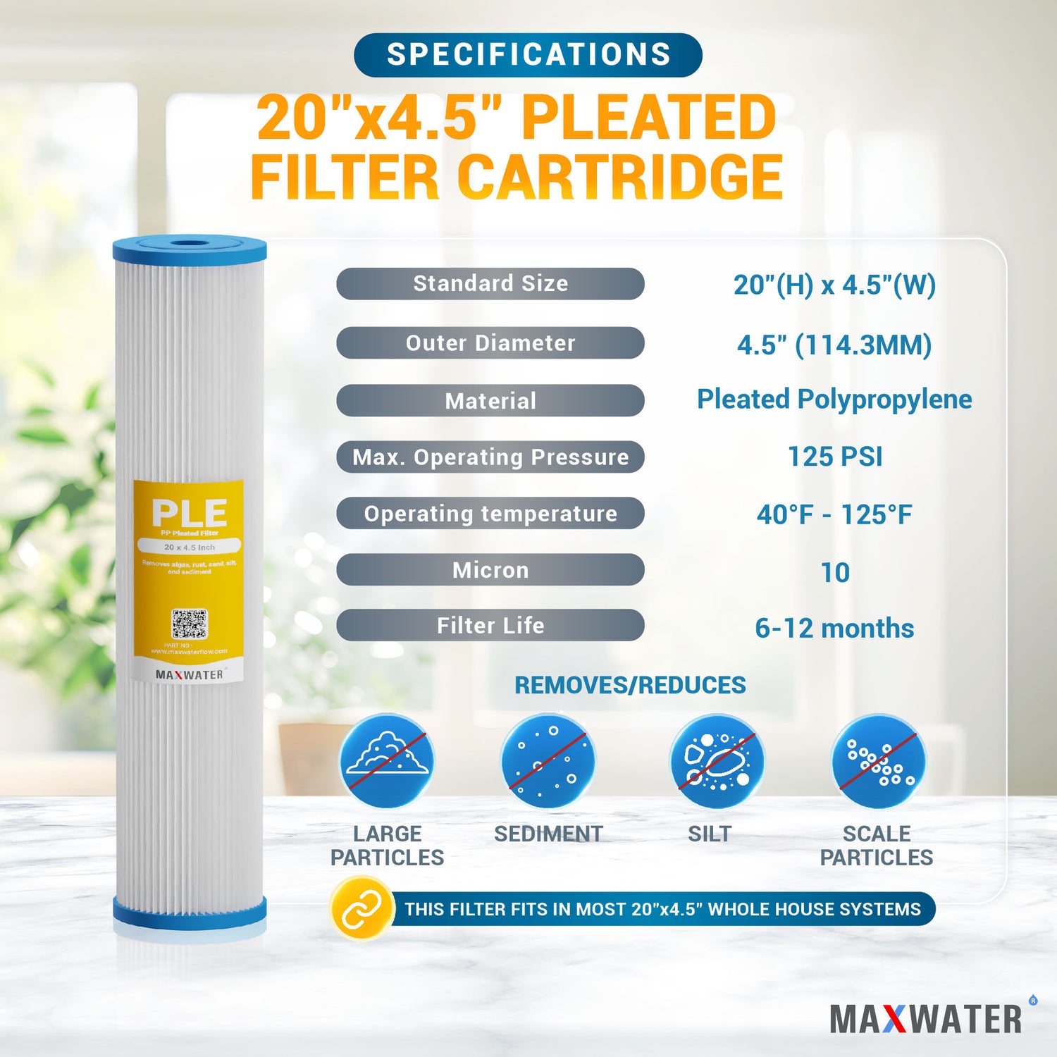 Discover the 20" Big Blue 10-Micron Pleated Sediment Filter Cartridge, crafted from pleated polypropylene material, providing a 10-micron nominal filter rating. Tailored to fit most Big Blue whole house filter housings with dimensions of 4.5" x 19.78", this filter effectively eliminates small particles and suspended matter, including silt, rust, sand, algae, sediment, and scale particles from your water supply. Compliant with FDA requirements for food and beverage contact, this washable filter allows for up to 4 uses, minimizing filtration costs. Operating between 40°F to 125°F, and with an operational pressure ranging from 40 to 125 PSI (maximum), this filter ensures optimal performance with a low surface area designed to reduce pressure drop across the filter stage. Each filter is individually wrapped for convenient handling and installation.