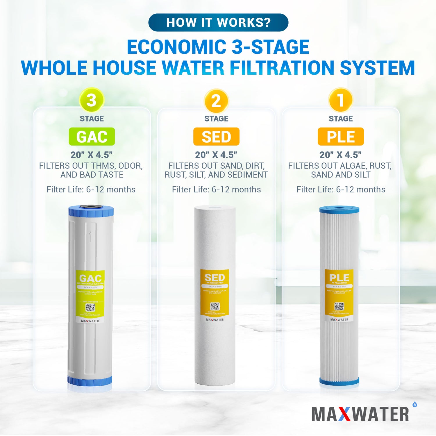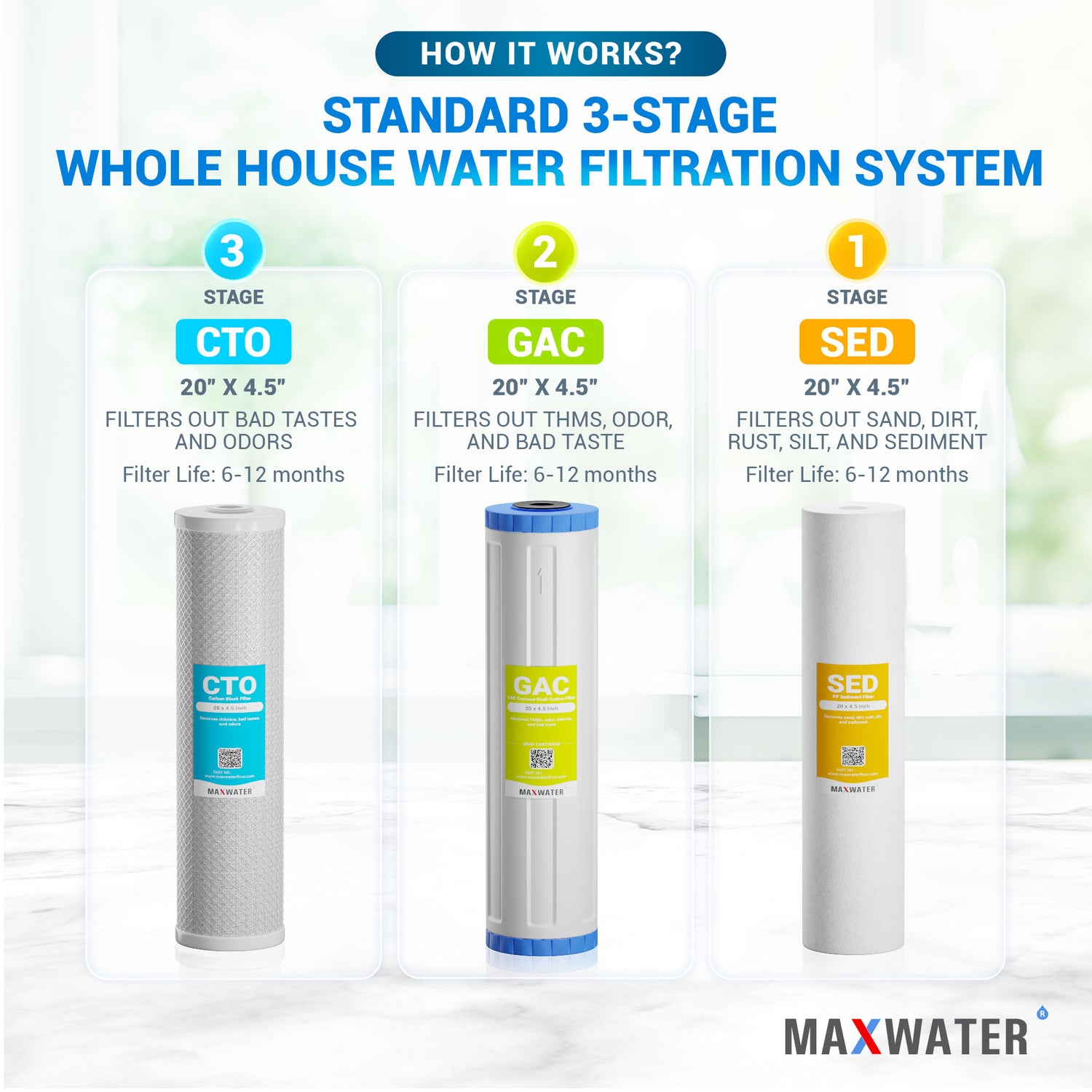 3rd filter (Granulated Activated Carbon Filter): The final stage employs granulated activated carbon (GAC) to remove impurities such as bad tastes, odors, chlorine, pesticides, herbicides, volatile organic compounds (VOCs), trihalomethanes (THMs), MTBEs (Methyl Tert-Butyl Ethers), and giardia cysts.